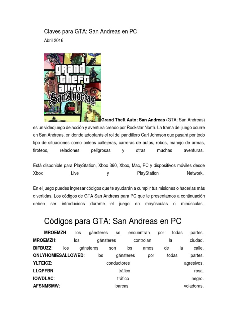 Claves Para Gta Pdf Videojuegos Franquicias De Videojuegos